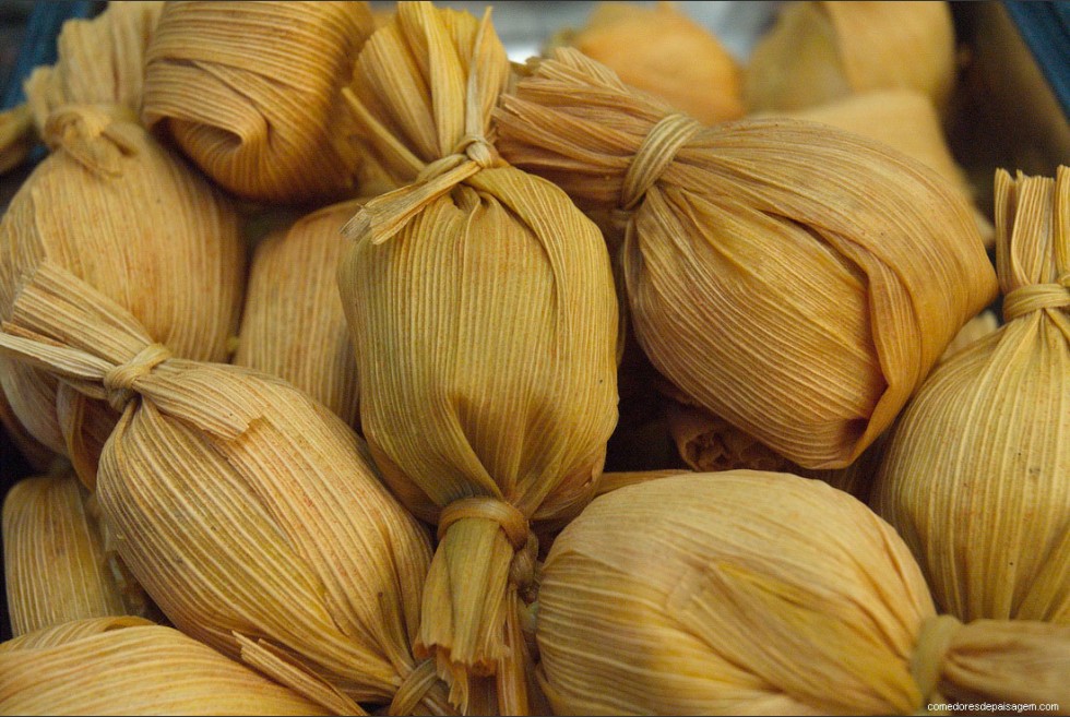 A receita original manda ralar um par de maçarocas de milho, mas costumo usar milho de frasco passado no 1-2-3, com bons resultados. Quanto ao invólucro, em Portugal não existe à venda, e por isso terá de arranjar as folhas verdes exteriores das espigas e secá-las antes de usar.