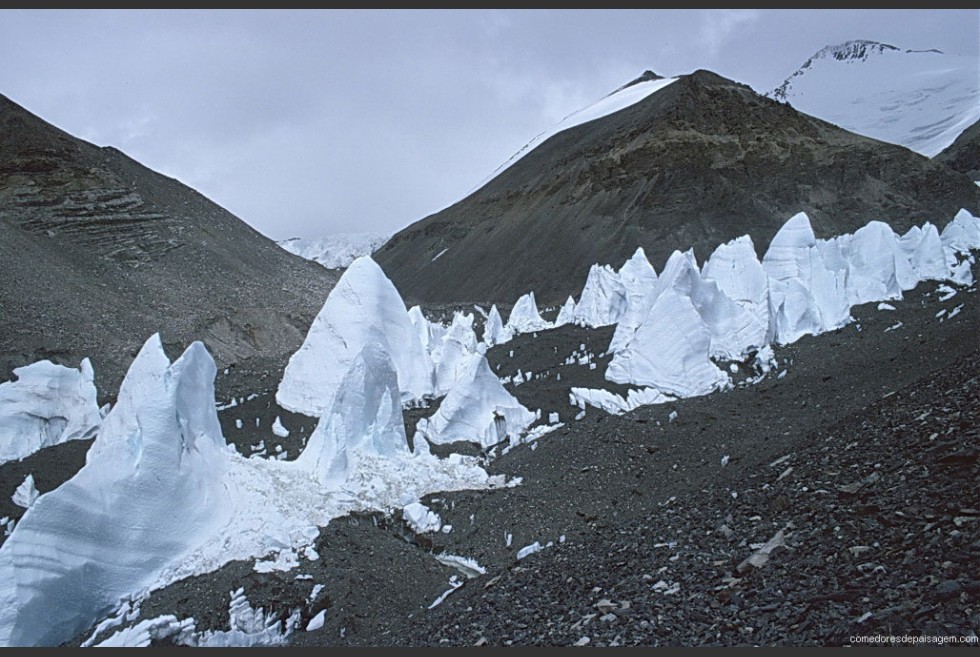 Não tivemos outro remédio senão percorrer o longo vale contra o vento, atingir o glaciar e dormir ao som dos gemidos e explosões que acompanham o movimento lento do gelo. No dia seguinte deixámos de ver a nossa deusa: estamos de tal maneira próximos que qualquer monte nos tapa a visão sobre a sua majestade. Subimos lentamente sobre um chão que parece vidro, coberto por alguma terra e muita pedra, que escorrega perigosamente. Dos dois lados erguem-se seracs ou penitentes, pedaços de gelo trabalhados pelo vento que chegam a atingir os trinta metros de altura. Lembram dentes aguçados ou velas de barco, erguendo-se abruptamente do cascalho escuro que cobre o glaciar. Alguns riachos violentos serpenteiam entre eles, e atravessamos duas pontes de gelo gotejantes para prosseguir. À nossa volta tudo está negro, como que calcinado: o chão, as vertentes e os picos aguçados dos montes que formam o corredor por onde avançamos. Parece não haver uma flor ou arbusto que consiga sobreviver neste lugar inóspito. As nuvens baixam, largando chuva, granizo, pedras de gelo que nos chicoteiam. Acabamos por descer antes dos seis mil metros, sem ter uma visão mais aproximada sobre a Chomolungma.