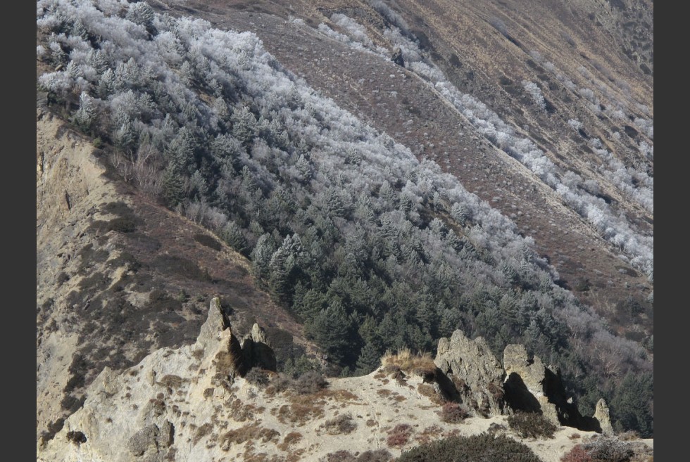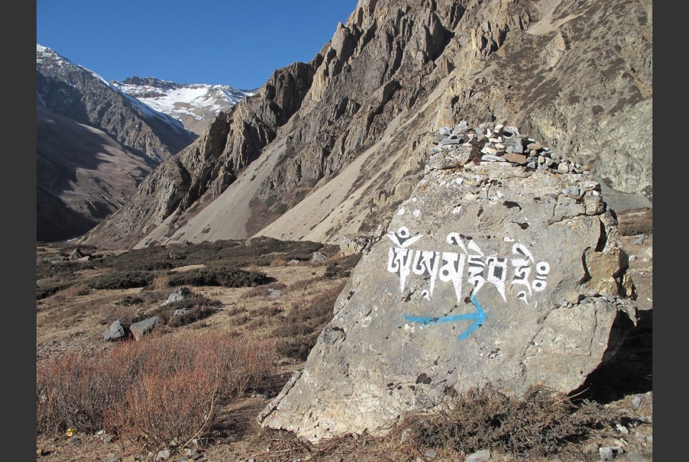 Continuando em direção a Yak Kharka, a paisagem fica cada vez mais perfeita: os bosques desaparecem, os últimos já polvilhados com neve; as rochas despontam do chão, esculpidas pelo vento e pelo gelo; as encostas levantam-se cada vez mais a pique, apertando o vale, e os picos com neve aproximam-se. À parte uma manada de iaques de cabelos ao vento, cuja timidez se sobrepõe ao aspeto ameaçador, nada mais parece conseguir viver nesta paisagem. Passei por manadas de antílopes, muitas aves de rapina, mamíferos felpudos que vinham espreitar dos arbustos e também um grupo de mulheres, que cantava enquanto colhia zimbro para vender junto aos templos budistas; agora sou só eu e os montes, as pontes suspensas sobre riachos enregelados, os picos brancos que se escondem e reaparecem.