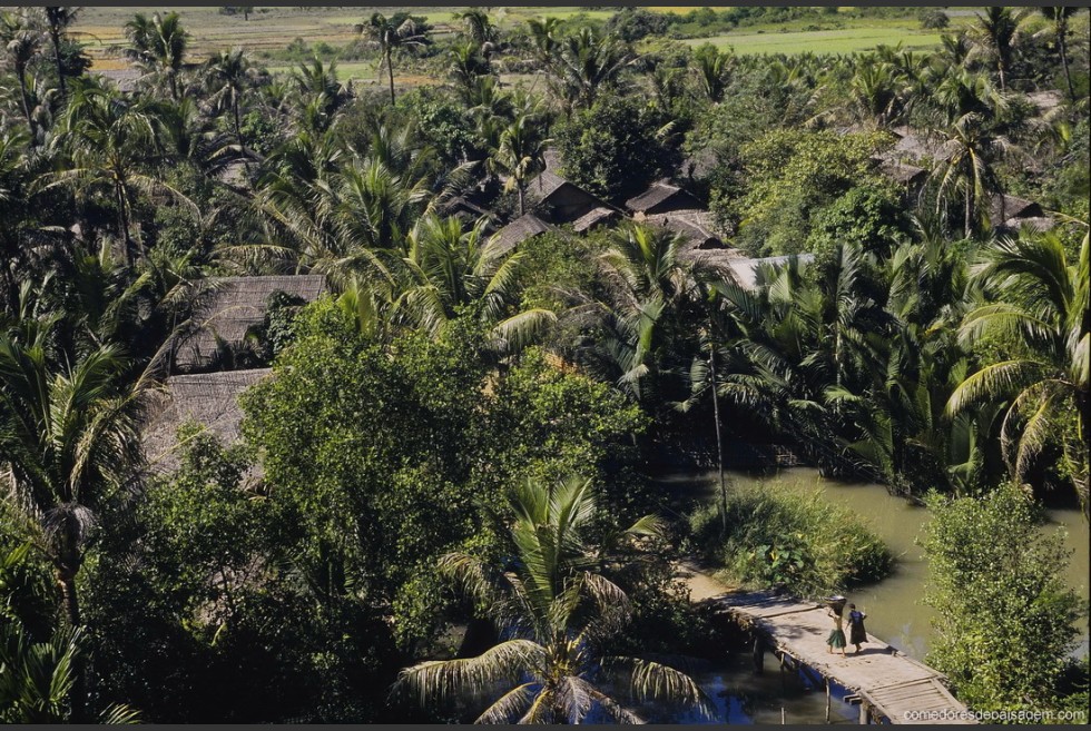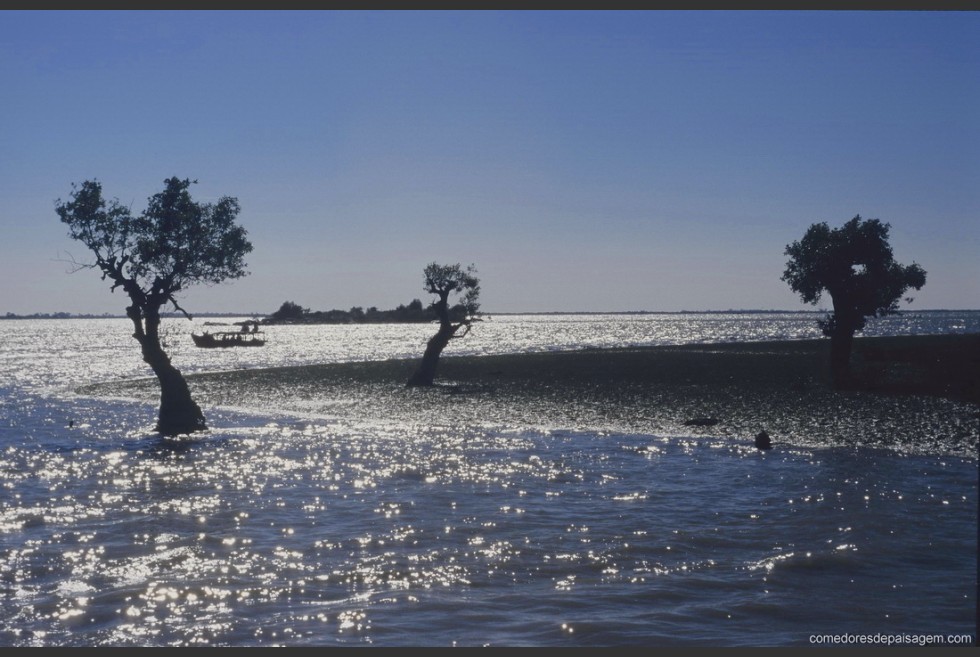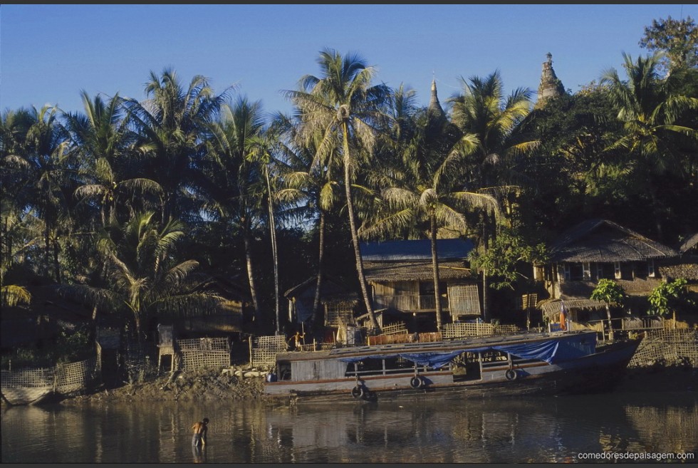 Criancinhas mamam no colo das mães, homens barbeiam os três pêlos do bigode com uma pinça, lava-se os dentes e aplica-se tanaka na cara, antes que venha o sol. Como ninguém fala uma língua comum, não sabemos quanto tempo vai durar a viagem e vamos apreciando as vistas da amurada. O barco avança por entre mangais e palmeiras, onde as aldeias só são denunciadas pelas pontas aguçadas dos pagodes. Percorremos canais e passamos por ilhas, sem nunca perdermos de vista a costa.