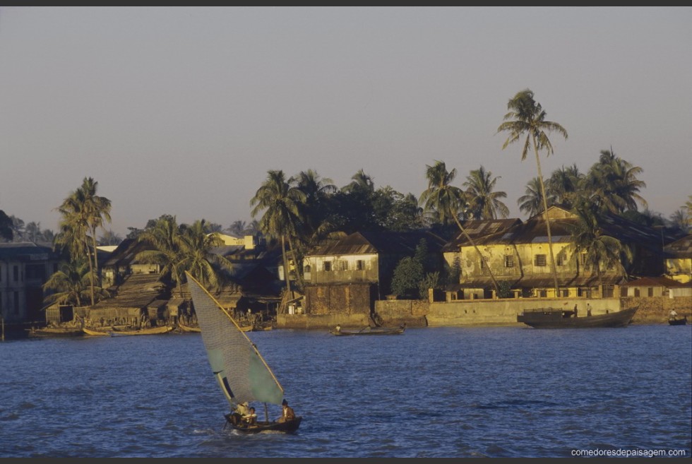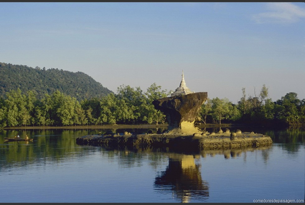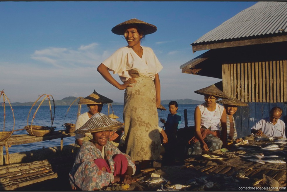 A comunicação com os companheiros de bordo também foi de vento em popa. Ofereceram-nos arroz – e uma colher para o comer, ao verem a nossa triste figura a tentar acertar com os grãos na boca. Os birmaneses é que não se atrapalham com esses detalhes; comem habilmente com as mãos, com pauzinhos, ou apenas com uma colher. O nosso guia de viagem fez grande sucesso, desaparecendo de mão em mão, para nos ser entregue por um desconhecido, horas mais tarde. As fotos de Aung San Suu Kyi e do seu pai eram as mais admiradas, e o facto de o andar de cima estar ocupado por militares não parecia assustar ninguém. E era da amurada superior que melhor se via deslizar a paisagem, composta por muita vegetação cerrada e verde, levantando-se das águas escuras da baía de Bengala. Em baixo, na “cozinha”, o caril de legumes levava alho, cebola, curcuma, (açafrão das Índias), canela, pasta de piripiri, cominhos, loureiro e água de demolhar tamarindos – muitos dos temperos que fizeram os portugueses rondar pela Ásia. Também havia arroz, frango estufado, e peixes empalados e fritos. O panelão era mexido com um velho remo e, no fim do almoço, um miúdo içou um balde de água do mar para lavar toda a louça do barco.