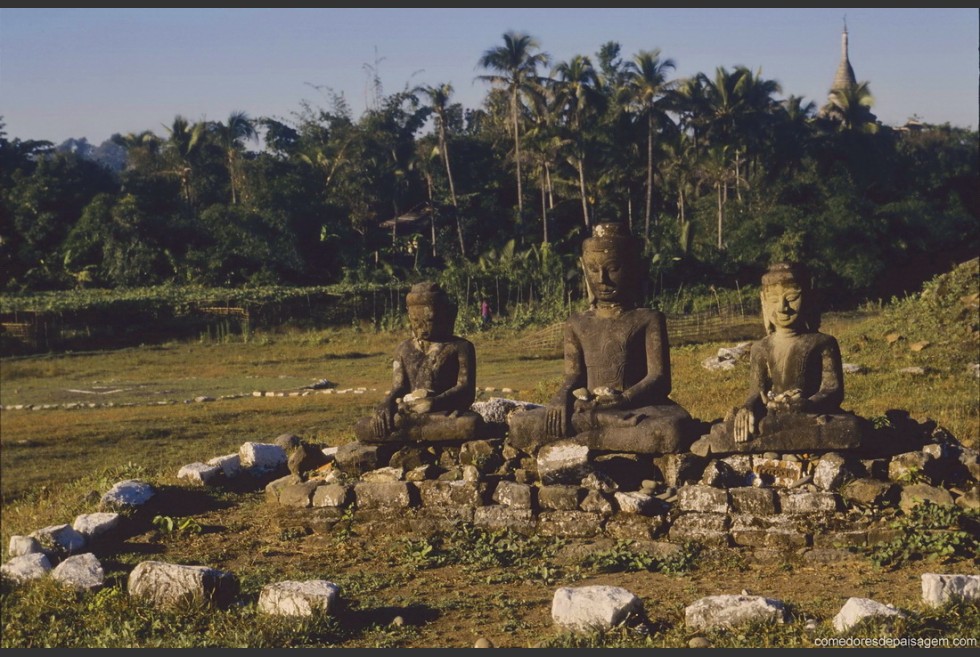 Saímos do porto e percorremos a costa em sentido inverso, até um braço de mar que liga ao rio Aungdat Chaung. Depois, o barco rabeia por um labirinto de ilhotas e penínsulas, sempre muito próximo das margens. Tão próximo que é possível apreciar a vida nas aldeias. Todas parecem ter um pequeno ancoradouro, que se enche de vendedores a cada paragem do barco. Há bolinhos de coco, pastéis de arroz, peixe, ovos cozidos, bananas, laranjas, etc. As palmeiras dão lugar a extensos arrozais, manchados pelo castanho das casinhas de bambu e das manadas de búfalos de água. Raparigas esguias, vestidas com cores fortes, acartam água em cântaros de metal prateado; magotes de miúdos chapinam na água escura das margens e acenam aos passageiros; homens de lunghi arregaçado trabalham nos arrozais e pescam com redes redondas, metidos na água até à cintura. Mrauk U é apenas mais uma destas aldeias serenas, anunciada por uma colina de onde sobressaem quatro pagodes que já foram brancos, como quatro “cornetos” gigantes.