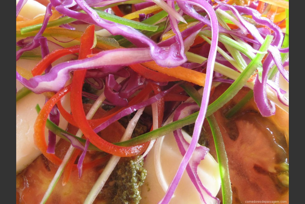 Lavar e cortar os tomates em rodelas finas e dispor uma camada num prato, alternando com fatias de queijo. Cortar os legumes numa juliana finíssima, e espalhar sobre a primeira camada. Regar com o molho Pesto.