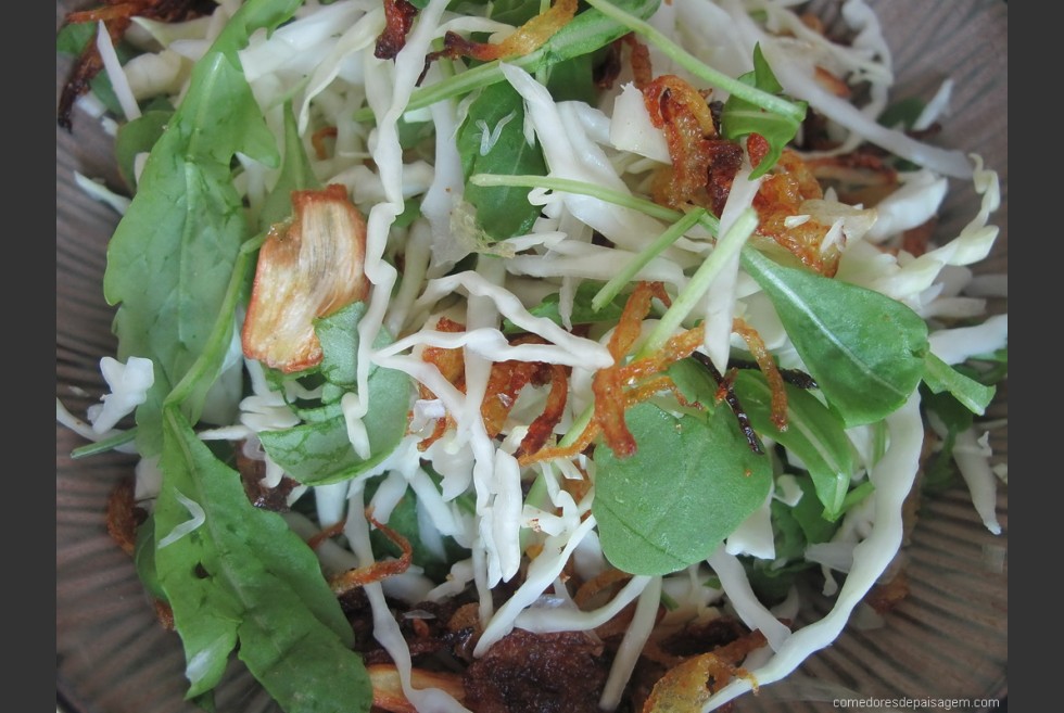 É preciso: alface, 1 chávena de couve branca em juliana, ½ cebola (de preferência vermelha) igualmente em juliana, uma chávena de folhas de rúcola em pedaços, 1 tomate cortado em palitos, óleo de amendoim (para fritar a cebola e o alho). O tomate pode ser substituído por feijão-verde cozido a vapor.