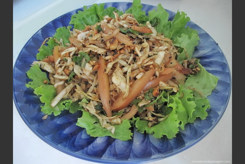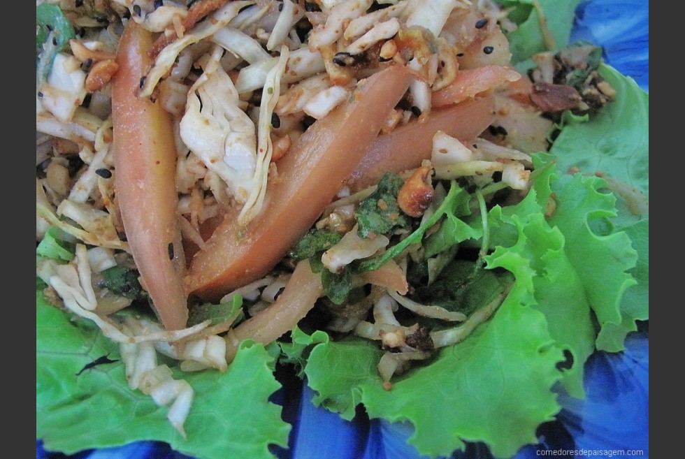 Ao contrário do que acontece na vizinha Tailândia, a gastronomia birmanesa não corre pelas bocas do mundo. Os sabores, os temperos e o gosto pela mistura do doce com o picante são idênticos, mas, por curioso que pareça, em Myanmar é mais fácil encontrar restaurantes com comida indiana e chinesa do que pratos típicos locais, como esta deliciosa salada.
